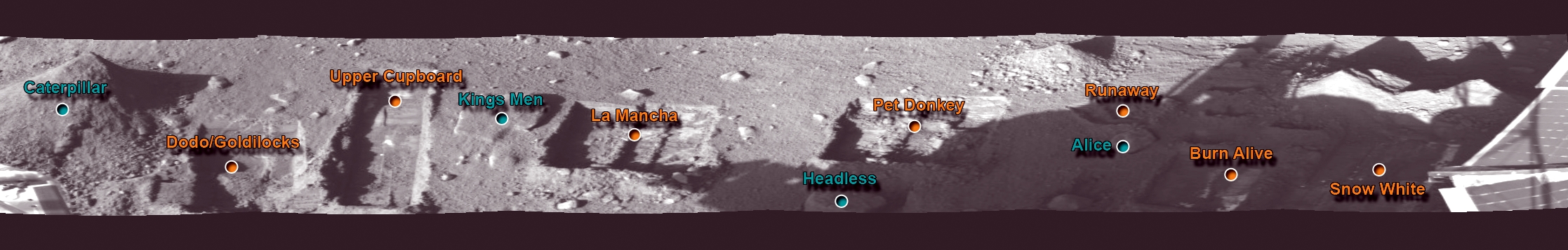 Phoenix hatte aus verschiedenen Bereichen Bodenproben entnommen und zur späteren Analyse in die verschiedenen mitgeführten Analysengeräte des Landers eingebracht. Das folgende Bild zeigt die Ergebnisse dieser Grabungsaktivitäten bis zum 10. Oktober 2008: