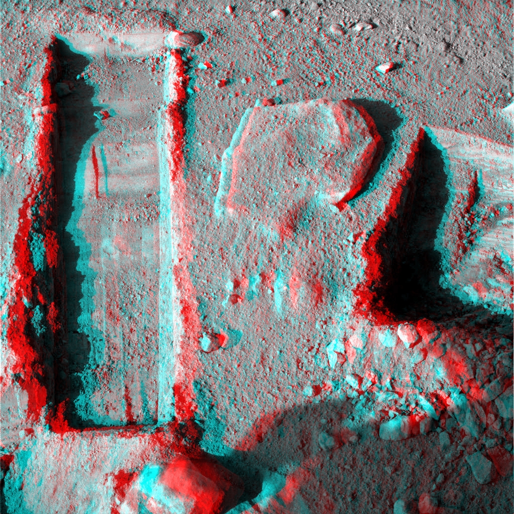 Abb. 1: Der Graben "Upper Cupboard" an Sol 142. Wie man sieht, ist um etwa 15:30 Uhr lokaler Zeit bereits der Abend angebrochen (relativ lange Schatten !), aber Eisbildung ist nicht zu sehen. Das rechte Bild zeigt mit einer rotgrün-Brille das Ganze in 3D.