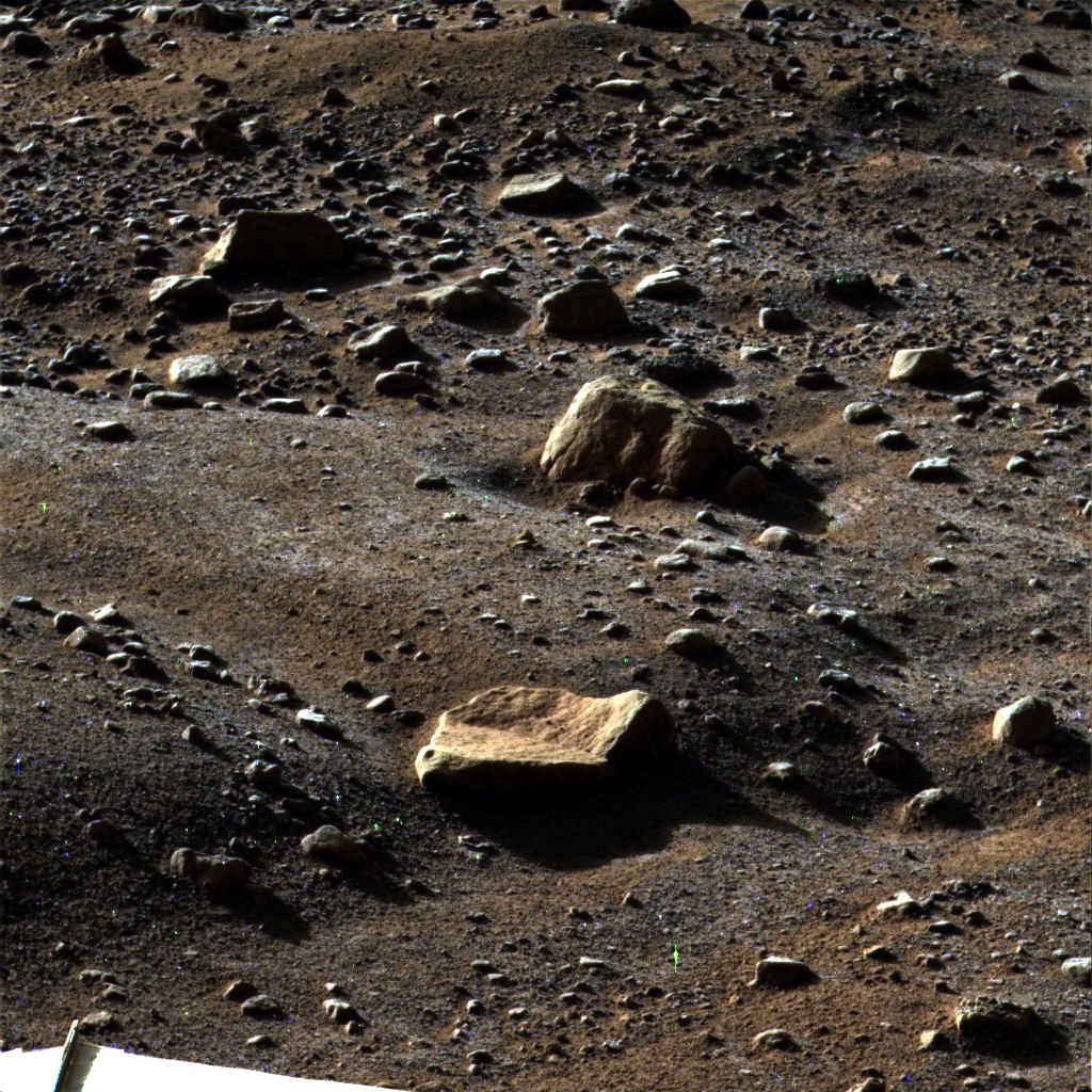 Abb. 3: Leicher Frostniederschlag am Morgen des Sol 141. Es handelt sich um Wassereis, denn bei den herrschenden Temperaturen ist die Bildung von Trockeneis (festes CO2) noch nicht möglich. Der Niederschlag löst sich mit steigenden Temperaturen während des Tages wieder auf. Diese Gegend wurde täglich immer wieder aufgenommen, um Veränderungen zu erfassen. Sie liegt südöstlich des Landers.