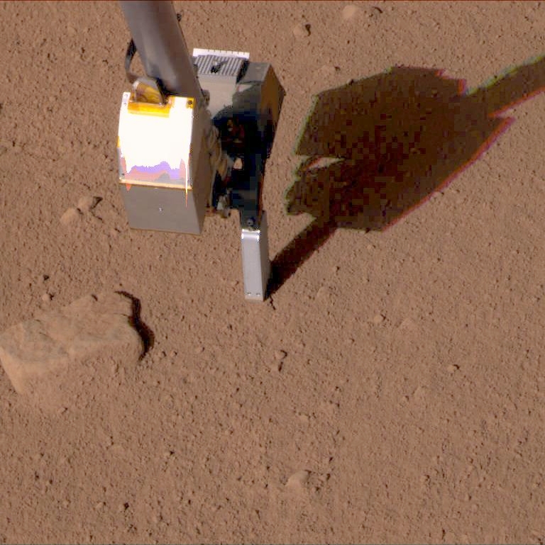 Am 10. Juli setzte Phoenix zum ersten Mal seinen am Instrumentenarm angebrachten Leitfähigkeitsmesser (TECP) für Bodenproben ein. Dieses Instrument gleicht einem kleinen Kamm am Ende der stiftähnlichen Meßelektronik, der mit den Zinken voran in das zu analysierende Material gesteckt wird und dann den zwischen den Zinken fließenden Strom mißt. Das nächsten Bilder zeigen das Instrument am Probenarm und ein kleines Filmchen des ersten Einsatzes: