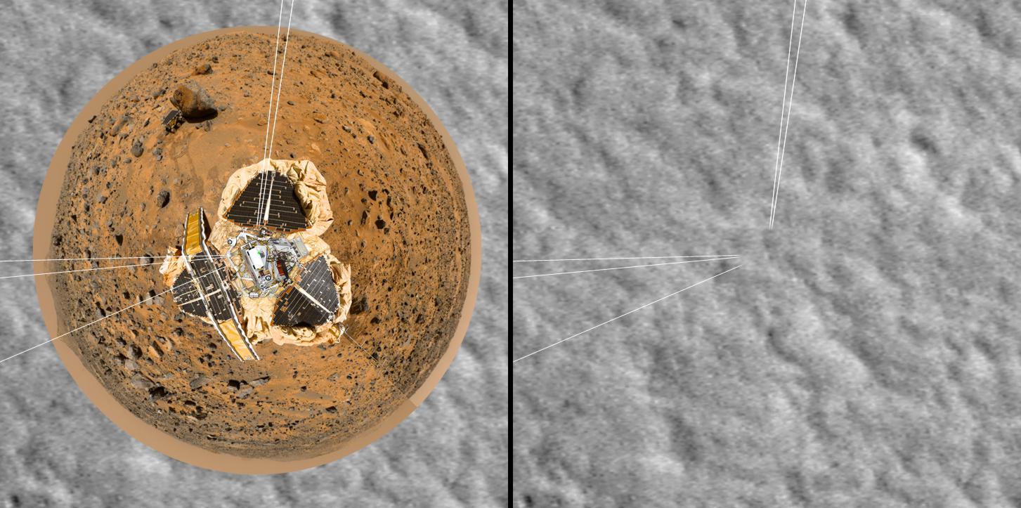 Das Bild unten zeigt eine starke Vergrösserung des aufgenommenen Bildes im Vergleich zu einer winkelgenauen Schemazeichung des Landers.