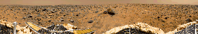 Diese beiden kleinen Bilder zeigen zunächst (links oder oben) den Lander, wie er seit über 30 Jahren auf der Oberfläche steht, und zum anderen (rechts oder unten) die auf der Oberfläche liegende Backshell, die kurz vor der Landung abgesprengt worden ist. Der an der Backshell hängende Fallschirm ist nach über 30 Jahren von Marsstaub überzogen und im Gegensatz zu dem Fallschirm von Viking Lander 1 (siehe weiter oben auf dieser Seite) nicht mehr sichtbar. Der bei der Landung abgesprengte Hitzeschild des Raumschiffes liegt etwa 3 km nordöstlich des Landeplatzes und konnte ebenfalls fotografiert werden (siehe hier). |