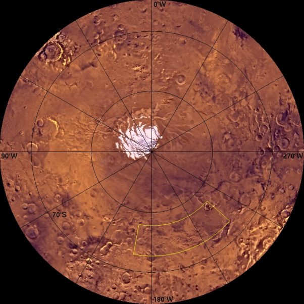 Der Mars Polar Lander wird in der Nähe des Mars-Südpols landen. Die Daten über das Aussehen des Landegebietes gehen weitgehend auf die Aufnahmen der Viking Orbiter von Mitte der 70er Jahre zurück (Durch Klicken auf das Bild erhält man eine vergrößerte Ansicht, der gelb umrandete Bereich markiert das Landegebiet für den Mars Polar Lander):