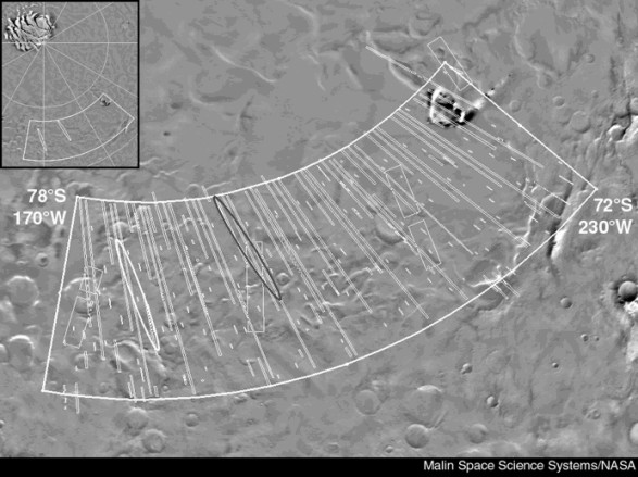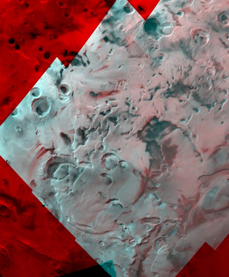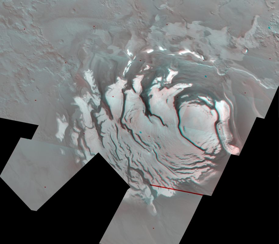 Die weißen Regionen sind aus Trockeneis, gefrorenem Kohlendioxid. bestehende Gebiete, das meiste Wassereis ist abgetaut und große Bereiche des Südpolargebietes sind eisfrei. Das folgende Bild zeigt das entsprechende Gebiet aus dem Orbit heraus aufgenommen (mit einer rotgrün-Brille wunderschön dreidimensional !). Durch Klicken auf das Bild erhält man eine vergrößerte Ansicht.