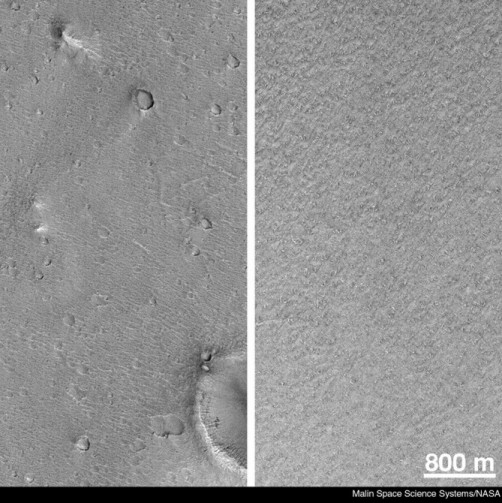 Vergleich des Landeplatzes von Mars Polar Lander (rechts) mit dem des Mars Pathfinder im