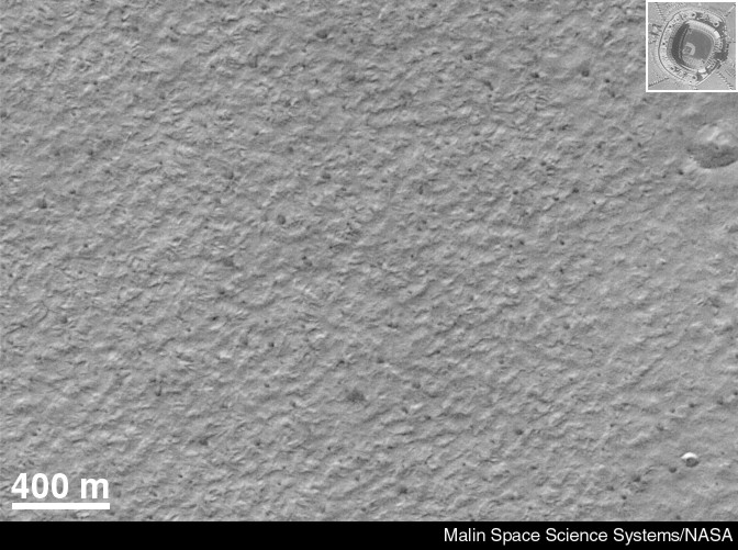 Baseballstadions in San Diego, USA oben rechts eingeblendet. Das Relief dieser Gegend zeichnet sich durch wenige Krater und etwa 1-2 m Höhenunterschied in etwa 15-20 m durchmessenden Bereichen aus, welches damit ein ungefährlicher Landeort sein dürfte. Der Blick geht auf einen dicken Eispanzer aus gefrorenem Kohlendioxid und Wassereis. Die am rechten Bildrand sichtbaren Krater sind 175m durchmessend und 17m tief (oben rechts) bzw. 60m durchmessend und 7m tief (rechts unten). Durch Klicken auf das Bild erhält man eine vergrößerte Ansicht.