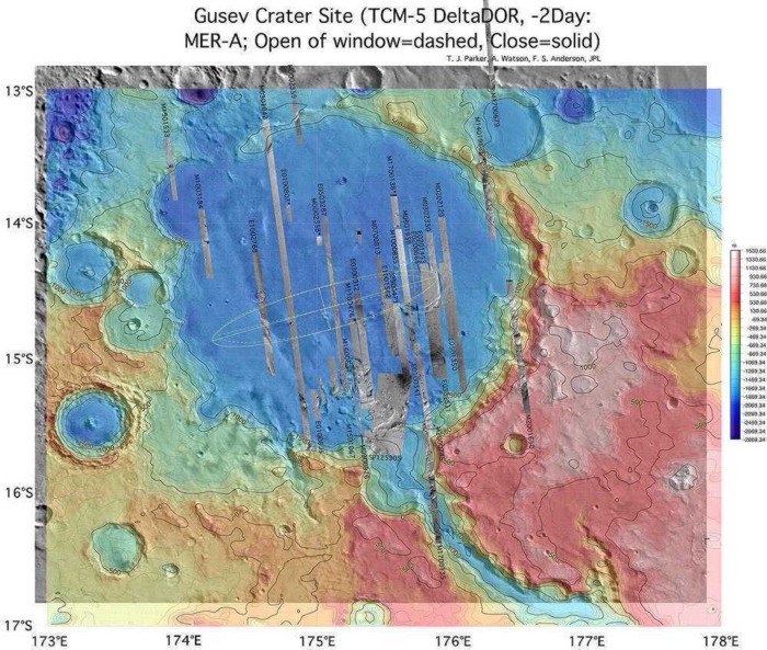 zusammengesetzt aus 9 Einzelaufnahmen, das Zwielicht nach Sonnenuntergang in Ares Vallis. Am Beginn ist die Sonne gerade rechts außerhalb des Bildes am Horizont und sinkt dann unter den Horizont ab innerhalb der nächsten Stunde. Da zu dem Zeitpunkt der Aufnahme kaum Staub in der Marsatmosphäre war, blieb der Himmel mehr als eine Stunde nach Sonnenuntergang völlig klar. Die Originalseiten sind hier. |