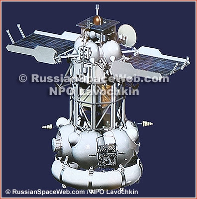 | Abb. 2: Phobos Grunt ausgestellt auf einer Raumfahrtmesse in Moskau. Das gesamte Raumschiff passt in eine Zenit-Oberstufe. Die goldene Halbkugel ganz oben ist die Rückkehrkapsel, die die Phobos-Bodenproben zurück zur Erde bringt. |